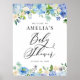 Bem-vindo a convidados para o seu evento com este sinal de boas-vindas personalizável ao chá de fraldas. Apresenta terras florais de cor aquosa de rosas azuis, roxas e brancas, anêmonas e híbridos. Personalize este sinal de chá de fraldas floral adicionando os detalhes do evento. Este sinal de boas-vindas ao chá de fraldas hydrangea é perfeito para chás de fraldas de primavera e inverno.