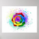 Rosa grande e florescente com pétalas arco-íris sobre fundo branco, pintadas com pedaços de tinta colorida e brilhante. 3d
