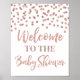 Bem-vindo ao sinal de chá de fraldas em um padrão de confete rosa dourado.
