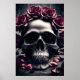 Uma pintura escura e gótica de um crânio humano cercado por rosas e pétalas góticas pidas, apresentando uma atmosfera gótica dessaturada e de outro mundo, esta poster gótica é perfeita para amantes de crânios góticos escuros e flores e rosas góticos românticos escuros.