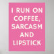 Adicione um traço de humor ao seu espaço com este vibrante poster cor-de-rosa com a frase hilária 'Eu corro no café, no sarcasmo e no Lipstick.' Perfeito para amantes de café e para aqueles com senso de humor agudo, esse design é personalizável e pode ser transferido para vários produtos como canecas, adesivos ou revistas. Excelente como presente para amigos ou familiares que apreciam citações espirituosas e um toque de sarcasmo
