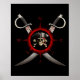 Crânio pirata, mancha de olho, chapéu pirata, e ossos cruzados para um clássico Jolly Roger no centro de um estilo vintage Compass Rosa com duas espadas piratas cruzadas atrás dele.