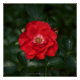 Uma fotografia de uma rosa vermelha num jardim. A flor está totalmente aberta expondo os caules amarelos do centro. Um par de botões vermelhos cresce atrás da flor principal. O fundo é cheio de folhas verdes. Imagem Copyright ©Kimberly J Tilley.