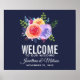 Bem-vindo ao nosso poster de casamento personalizado com um buquê floral fantástico com rosas de aquarela. Na moda, capricho e criativo. Um conjunto de rosas em rosa, roxo e amarelo. Com muitos galhos e folhas em verde, rosa, roxo e azul. fundo azul marinho.