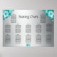 Este elegante gráfico de assentos de prata e talheres para a recepção tem um lindo tema de rosa aqua/teal. Há belíssimos buquetes de rosa aqua em cada esquina no topo, e um punhado menor de rosas aqua no fundo do gráfico. Ao fundo há uma prata metálica luxuosa.