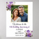 Este sinal de boas-vindas do Aniversário do Casamento tem uma elegante caligrafia de script, uma estrutura dourada com 1 foto especial e rosas roxos. Você pode personalizar este sinal com seus detalhes de aniversário de casamento.