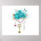 Chave de ouro antiga com rosas de turquesa de tendência, decoradas com folhas de ouro branco e miçangas cor-de-rosa e azuis. Cor agradável. Rosas de turquesa. Ouro branco. Tifania azul.