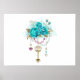 Chave de ouro antiga com rosas de turquesa de tendência, decoradas com folhas de ouro branco e miçangas cor-de-rosa e azuis. Cor agradável. Rosas de turquesa. Ouro branco. Tifania azul.