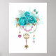 Chave de ouro antiga com rosas de turquesa de tendência, decoradas com folhas de ouro branco e miçangas cor-de-rosa e azuis. Cor agradável. Rosas de turquesa. Ouro branco. Tifania azul.