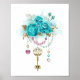 Chave de ouro antiga com rosas de turquesa de tendência, decoradas com folhas de ouro branco e miçangas cor-de-rosa e azuis. Cor agradável. Rosas de turquesa. Ouro branco. Tifania azul.