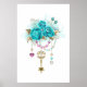 Chave de ouro antiga com rosas de turquesa de tendência, decoradas com folhas de ouro branco e miçangas cor-de-rosa e azuis. Cor agradável. Rosas de turquesa. Ouro branco. Tifania azul.