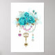 Chave de ouro antiga com rosas de turquesa de tendência, decoradas com folhas de ouro branco e miçangas cor-de-rosa e azuis. Cor agradável. Rosas de turquesa. Ouro branco. Tifania azul.