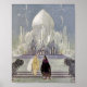 Ilustração colorida da safra do livro "Old French Fairy Tales". Ilustradora Virginia Sterrett. A ilustração mostra Rosette e o Príncipe com o castelo de conto de fadas ao fundo.