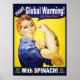 Humorous Rosie, a poster Riveter; uma Rosie, de grande porte armada, tatuada com âncora, defendendo contra o aquecimento global indo para Vegan e comendo espinafre. Posters, t-shirts, cartas, presentes.