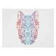 Um desenho artístico do rosto de um lobo em cores azuis, turquesas e gradientes vermelhos.