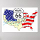 Um poster com um mapa dos Estados Unidos mostrando o caminho da Rota Histórica 66 pela América.