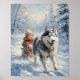 Um Cachorro Rouco está puxando uma criança feliz e sorridente em uma paisagem de neve derrubada.