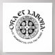 Um poster inspirador com um impressão da caligrafia manual de Ruas de A.R. Danziger. O lema de Benedict e desenho de uma Rua. medalha Benedict. O roteiro social diz "Ora e Labora" (oração e trabalho) e "Rua. Benedicte, ora pro nobis" (Rua. Benedict, reza por nós).