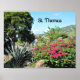 Uma bela vista de flores e plantas tropicais na Ilha Virgem Americana de Ruas. Thomas. Uma espiada na água azul e na montanha com casas estão no fundo. Palavras: "Rua. Thomas" está escrito em cena.