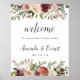 Bem-vindos convidados para o seu casamento com nosso poster Rustic Bloom, com culturas botânicas de cor aquática e flores em cores ricas do outono, com "bem-vindos a nossa felicidade para sempre", seus nomes, e data de casamento em uma mistura de serifas e tipos de caligrafia tradicionais.
