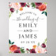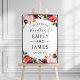 Poster / sinal de boas-vindas do casamento apresenta texto na moda, enquadrado por uma bela coroa rústica do verão e caindo flores aquarelas, incluindo rosas, dahlias, flores de pénia, e verde, em uma bela paleta de outono de vermelho-lenhoso, amarelo-ouro, cor-de-rosa-pincel e tons de verde. Personalize com os nomes da noiva e noiva e a data do casamento.