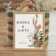 Woodland themed baby shower books and gifts poster sign featuring rustic winter forest and animals design.