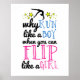 A poster de ginástica decora com o texto, "Por que correr como um menino quando você pode sacudir como uma garota".... Tem uma silhueta de ginastas e estrelas amarelas. O texto é preto, azul e rosa. Seu ginasta vai adorar isso! ©gollygirls.com