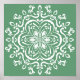 Esta mandala branca senta-se sobre um fundo verde-cinza. As cores são naturais e relaxantes. Parte da coleção Losonieth Mandala.