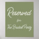 Poster de Sage Green Reserved Sign Banner com texto de caligrafia branco para casamento, janto de ensaio, chá de panela, noivado ou qualquer outra ocasião semelhante. Este produto faz parte de uma coleção; portanto, por favor, verifique nossa coleção de lojas para itens correspondentes.