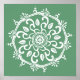 Esta mandala branca senta-se sobre um fundo verde-cinza. As cores são naturais e relaxantes. Parte da coleção Payon Mandala.