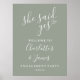 Este elegante sinal de festa de compromisso "ela disse sim" na cor sage verde pode ser personalizado com as informações da sua festa especial. Projetado por Thisisnotme©