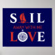 Inscrição branca e vermelha SAIL AFASTADO COMIGO AMOR, veleiro e rosa de vento em um fundo azul marinho. Tema marítimo para um verdadeiro amante da aventura.