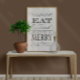Poster elegante vitoriano estilo vitoriano para cozinha, bar, café ou restaurante. As palavras dizem: "Coma Bebida e Seja Feliz!" A cor branca do fundo é personalizável.