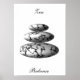 Um design simples, limpo, estético de Zen com três pedras lisas, ovais, dispostas em uma pilha vertical, com a maior pedra no fundo, uma pedra média no meio, e a menor pedra no topo, criando uma imagem de equilíbrio perfeito de Zen.