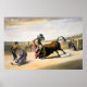 Ilustração Vintage 1860s Lake Price mostrando um matador, durante uma tourada, saltando do caminho de um touro de carga enquanto mergulha na capa.