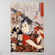 ☆ O padrão do crânio que desenhou o ator vestindo um quimono foi concebido para combinar vários gatos. Utagawa Kuniyoshi (1º de janeiro de 1798 - 14 de abril de 1861) foi um dos últimos mestrados do estilo ukiyo-e japonês de impressões de bloco de madeira e pintura. Ele é associado à escola Utagawa. A gama de assuntos preferidos de Kuniyoshi incluía muitos gêneros: paisagens, belas mulheres, atores de Kabuki, gatos e animais míticos. Ele é conhecido por representações das batalhas de samurai e heróis lendários. Sua trabalho de arte foi afetada por influências ocidentais em pintura paisagística e caricatura. Ele adorava gatos na vida privada.