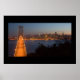 A bela ponte da Baía de São Francisco e o horizonte da cidade de São Francisco ao amanhecer. Os rastros de trânsito dos carros são visíveis na ponte.