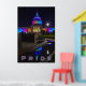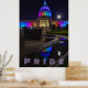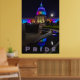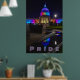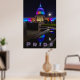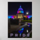Uma fotografia noturna captura a prefeitura de São Francisco banhada em cores vibrantes do arco-íris. A cúpula icônica, adornada com a bandeira do orgulho LGBTQ+, destaca-se contra o céu escuro. A fachada do prédio é iluminada com um espectro de cores, criando uma exibição deslumbrante. No primeiro plano, uma piscina refletora reflete as luzes coloridas, adicionando um toque sereno e etéreo à cena.