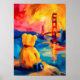 Warm San Francisco teddy fauvist artwork featuring a contemplative teddy bear silhouette overlooking the Golden Gate Bridge at sunset. Bold fauvist color planes and crisp geometric bay reflections create vibrant wall art perfect for california lovers, nursery decor, and modern interiors.