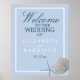 Esta poster de boas-vindas é perfeita para qualquer casal planejando um casamento elegante na praia. A design apresenta um dólar de areia cremoso e um peixe-estrela azul-claro com fundo azul-céu. A design está acabada com uma delicada borda de areia. O design simples e fresco pode ser personalizado para se adequar ao seu evento especial e será o sinal perfeito de boas-vindas para qualquer festa temática na praia, incluindo chás de panela, noivados, chás de casamento, festas de aniversário e muito mais.