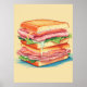 Uma ilustração deliciosamente detalhada de um sanduíche torrencial de três camadas, com pão torrado, camadas de presunto em fatias finas, alface nítida, e queijo derretido com ar. As texturas e cores vibrantes trazem a riqueza desta refeição gourmet, que é um banquete para os olhos e para o apetite.