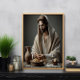Jesus está sentado a uma simples mesa, vestido com um roupão branco fluido com uma cobertura de cabeça, incorporando humildade e graça. Suas mãos delicadamente seguram um pedaço de pão enquanto Ele executa o ato sagrado de quebrá-lo. Este momento significa a Última Ceia, pedra angular da teologia cristã e símbolo de amor, unidade e sacrifício. A cena é pacífica e contemplativa. Ao lado dele estão dois vasos de argila — um se assemelhando a uma jarra de vinho, evocando o pacto de Seu sangue, e o outro aprimorando a simplicidade do cenário. Uma cesta tecida, cheia de torresmos recentemente cozidos, significa abundância e dissimulação divina. A expressão gentil de Jesus irradia a solenidade espiritual profunda, atraindo o espectador para a tranquilidade do momento. Os modestos elementos do pão e do vinho simbolizam a profunda mensagem de humildade, serviço e nutrição da alma. Essa representação encoraja a reflexão sobre o sagrado do eucarista e o amor Jesus exemplificado por seu sacrifício. A simplicidade dos arredores enfatiza a importância da riqueza espiritual sobre os bens materiais. Essa imagem inspira devoção, convidando crentes a se reconectar com o núcleo de sua fé e a eterna mensagem de esperança e salvação.