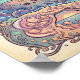 Along the shoreline, the illustration bursts into dynamic motion with iconic surf spots like Steamer Lane and Pleasure Point. Surfers ride curling waves rendered in bold, sweeping shapes, giving the ocean a rhythmic, almost musical quality. The water feels alive, filled with fantastical sea creatures, swirling currents, and bright color transitions that celebrate Santa Cruz’s deep connection to surf culture. The presence of a giant octopus and a friendly sea dragon adds a layer of fantasy, transforming the coastline into a lively underwater world where imagination and reality blend seamlessly.