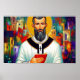 Este retrato impressionante da Rua. Cirilo de Jerusalém mistura lindamente a iconografia tradicional com um estilo artístico vibrante e moderno. Apresentado com um olhar solene, mas compaixão, Ruas. Cyril é mostrado segurando as escrituras sagradas, simbolizando sua devoção a ensinar e defender a fé cristã. O fundo radiante, rico em cores ousadas e paisagens abstrato, evoca a profundidade espiritual e o significado histórico de Jerusalém.