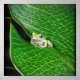 Esta imagem de um sapo verde minúsculo numa folha verde grande é certamente agradável a qualquer amante do sapo.