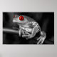 Foto muito legal, em preto e branco, de um sapo de árvore com grandes olhos vermelhos