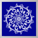 Esta mandala branca senta sobre um fundo azul brilhante e profundo. As cores são inteligentes e introspectivas. Parte da coleção Payon Mandala.