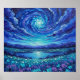 This dreamy poster features a blue landscape painting: swirling starry sky above a tranquil lake, distant mountains and a vibrant foreground meadow of glowing wildflowers. Finished in a oil acrylic paint print.