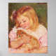 Essa linda garotinha está segurando gentilmente sua tábua laranja precioso no gatinho.