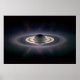 Tamanho recomendado para ajustado de um quadro padrão: 18x12 polegadas (tamanho original: 9x5 polegadas a 300 PPI, MP). Muitos outros tamanhos disponíveis. Clique em 'Personalizar!' à direita. Com Saturno gigante pendurado na escuridão e abrigando Cassini do brilho cegante do sol, a espaçonave viu os anéis como nunca antes, revelando anéis desconhecidos e até mesmo vislumbrando seu mundo natal. Essa maravilhosa visão panorâmica foi criada pela combinação de um total de 165 imagens tiradas pela câmera de grande ângulo Cassini em quase três horas no dia 15 de setembro de 2006. O mosaico do cheio consiste em três filas de nove pegadas de câmera de ângulo largo; apenas uma parte do mosaico do cheio é mostrada aqui. A cor na vista de contraste de cor exagerada foi criada por meio da composição digital de imagens ultravioletas, infravermelhas e de filtros claros, tendo sido depois ajustada para se assemelhar à cor natural. As imagens do mosaico foram adquiridas à medida que a espaçonave se espalhava na escuridão da sombra de Saturno por cerca de 12 horas, permitindo diversas observações únicas das partículas microscópicas que compõem os anéis esmaecidos de Saturno. As estruturas de anéis que contêm estas minúsculas partículas brilham substancialmente em ângulos de fase alta, isto é, ângulos de visão onde o sol está quase diretamente atrás dos objetos que estão a ser pintados. Nesse período de observação, a Cassini detectou dois novos anéis esmaecidos: um coincidente com a órbita compartilhada das luas Janus e Epimetheus e outro coincidente com a órbita de Pallene. (Consulte The Janus/Epimetheus Ring and Moon-Made Rings para obter mais informações sobre os dois novos anéis.) O anel G estreito é facilmente visto aqui, fora dos anéis principais brilhantes. A consolidação de todo o sistema é o anel E muito mais estendido. As geleiras de Enceladus, cujas erupções fornecem as partículas do anel E, traem a posição da lua na borda esquerda do anel E. Interior ao anel G e acima dos anéis principais mais brilhantes é o ponto pálido da Terra. A Cassini vê seu ponto de origem a mais de um bilhão de quilômetros (e cerca de um bilhão de milhas) de distância nas profundezas geladas do sistema solar externo. Veja Pale Blue Orb para uma visão semelhante da Terra tirada durante esta observação. Grãos pequenos são empurrados pela luz solar e forças eletromagnéticas. Daí sua distribuição diz muito sobre o ambiente espacial local. Uma segunda versão do mosaico é apresentada aqui, na qual o contraste de cor é muito exagerado. Nessas visões, cientistas da área de imagens perceberam variações de cores nos anéis difusos que implicam processos ativos que separam as partículas do anel de acordo com seus tamanhos. Olhando para o anel E nesta vista exagerada de cor, a distribuição de cor entre e ao longo do anel parece ser diferente entre o lado direito e o esquerdo. Os cientistas ainda não sabem como explicar essas diferenças, embora a diferença no ângulo de fase entre direita e esquerda possa fazer parte da explicação. O ângulo de fase é cerca de 179 graus em Saturno. Os anéis principais estão superexpostos em alguns lugares. Esta vista aponta para o lado não iluminado dos anéis a cerca de 15 graus acima do plano de rotação. A Cassini estava a cerca de 2,2 milhões de quilômetros (1,3 milhão de milhas) de Saturno quando as imagens nesse mosaico foram tiradas. A escala de imagens em Saturno é cerca de 260 quilômetros (162 milhas) por pixel. A missão Cassini-Huygens é um projeto cooperativo da NASA, da Agência Espacial Europeia e da Agência Espacial Italiana. O Laboratório de Propulsão a Jato, uma divisão do Instituto de Tecnologia da Califórnia em Pasadena, gerencia a missão da Diretoria de Missão Científica da Nasa, Washington, D.C. O orbiter da Cassini e suas duas câmeras a bordo foram projetados, desenvolvidos e montados no JPL. O centro de operações de representação gráfica é baseado no Instituto de Ciência Espacial em Boulder, Colo. Crédito: NASA/JPL/Space Science Institute